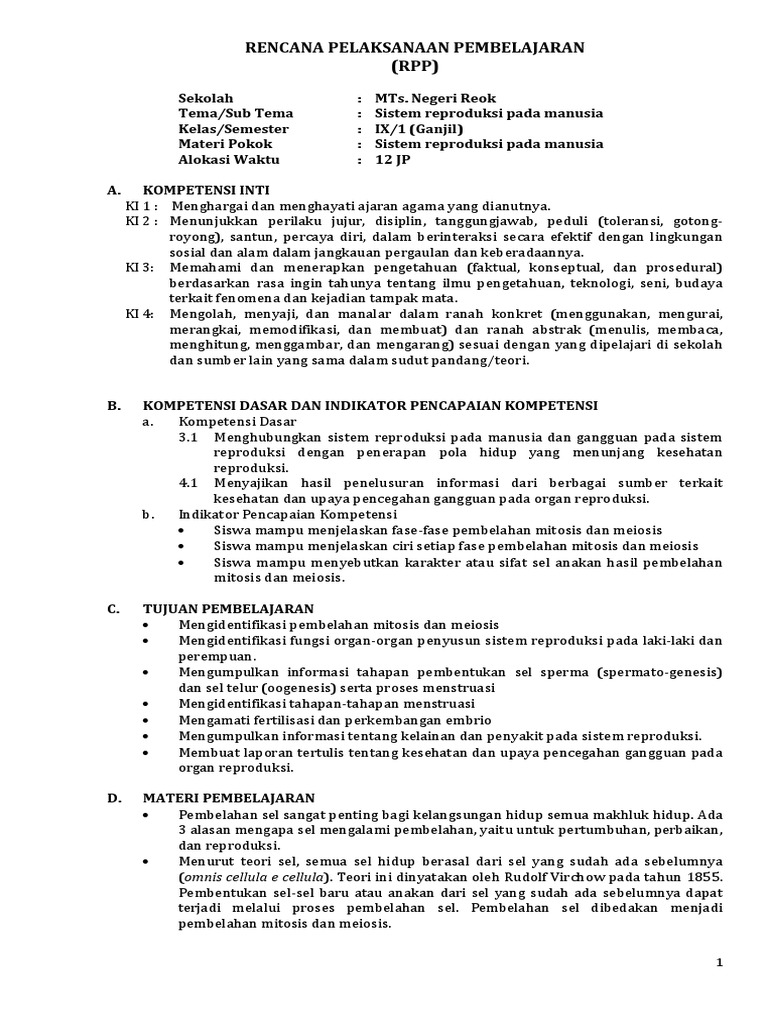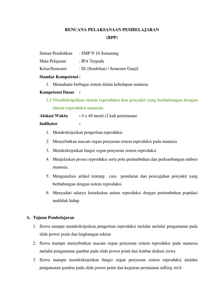 Rpp Kelas 9 1 Sistem Reproduksi Manusia