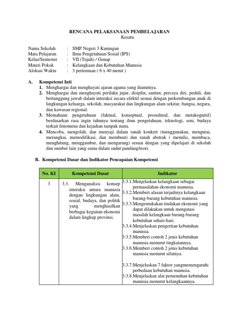 1 Rpp Ips Kelas 7 Kelangkaan Dan Kebutuhan Manusia