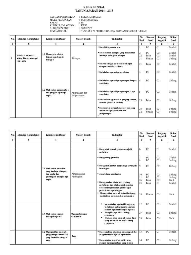 Kisi Kisi Uas Matematika Kelas 3 Sd