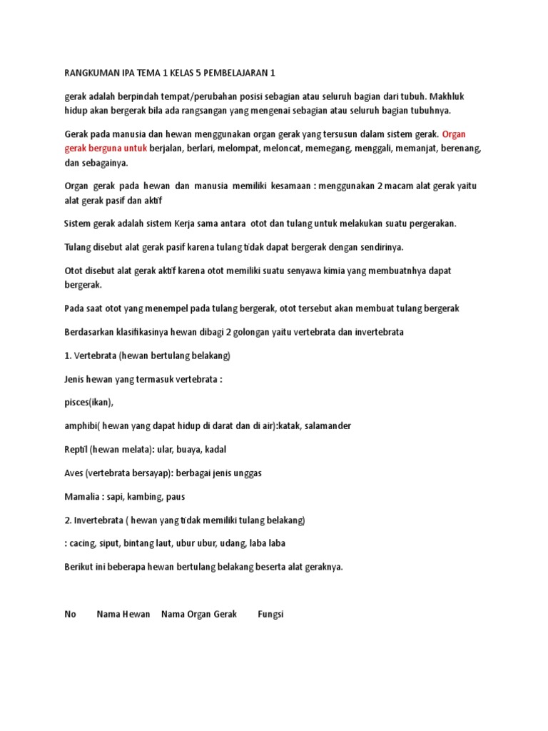 Tema 1 Kelas 5 Organ Gerak Hewan Dan Manusia