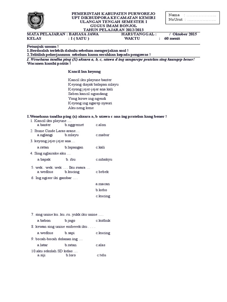 Kisi Kisi Dan Soal Uts 1 Sd Kelas 1 Bahasa Jawa Ayo Sinau Bareng