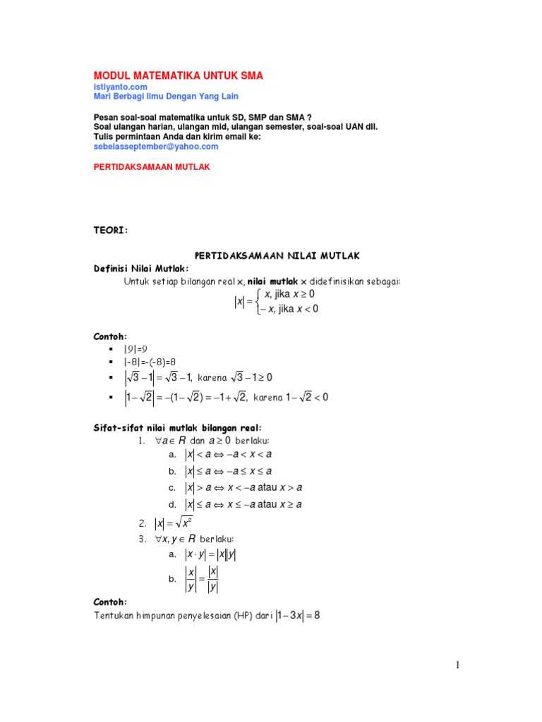 Download Soal Persamaan Nilai Mutlak Pdf Matematika Wajib Kelas X