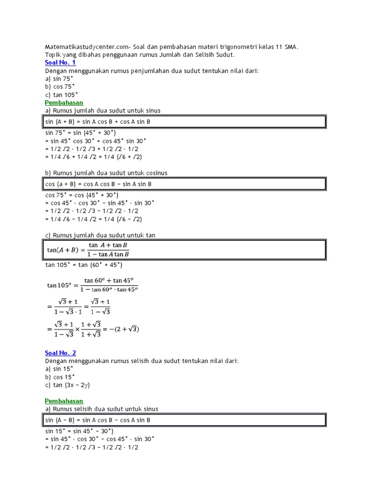 Pelajaran Soal Rumus Penjumlahan Pengurangan Dua Sudut Pada